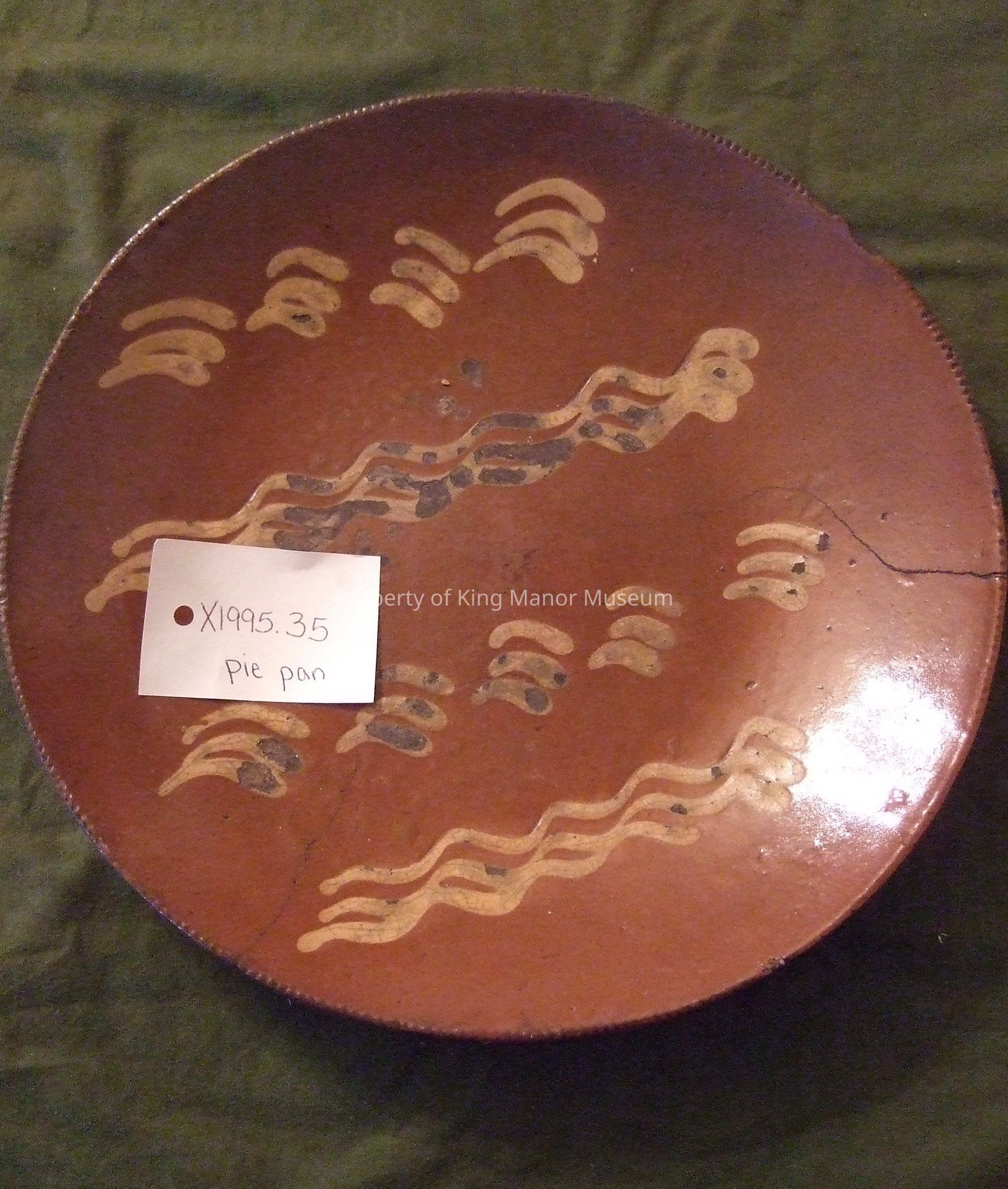 Redware plate having zig-zag slip decoration Illegible words written on the bottom in ink or black slip