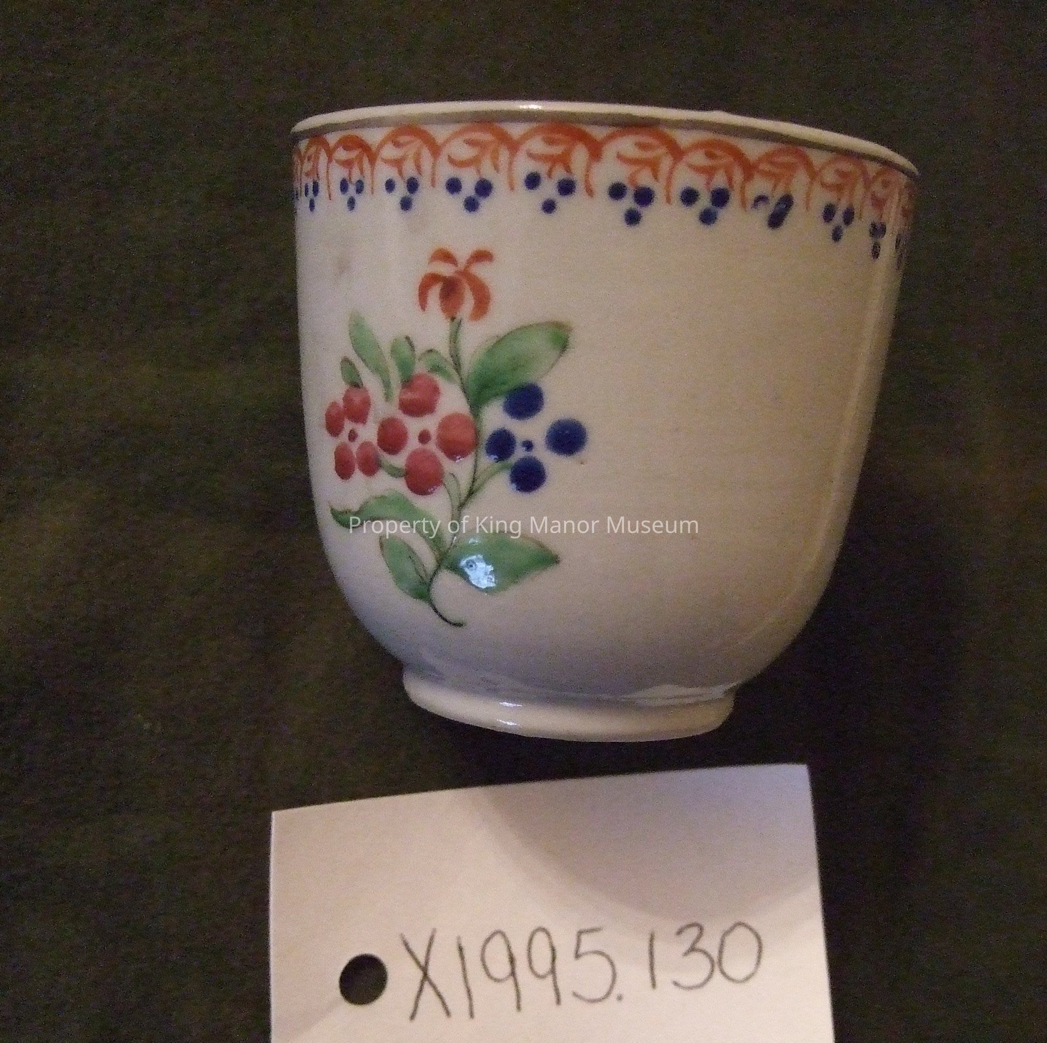 White porcelain teacup having red and blue floral and berry sprig handpainted decoration on body and corresponding rim decorationCollection