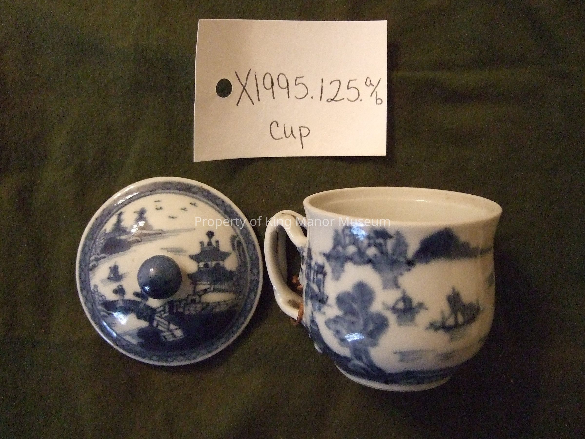 White Chinese export porcelain cup and lid (b) having blue handpainted oriental scene double handles