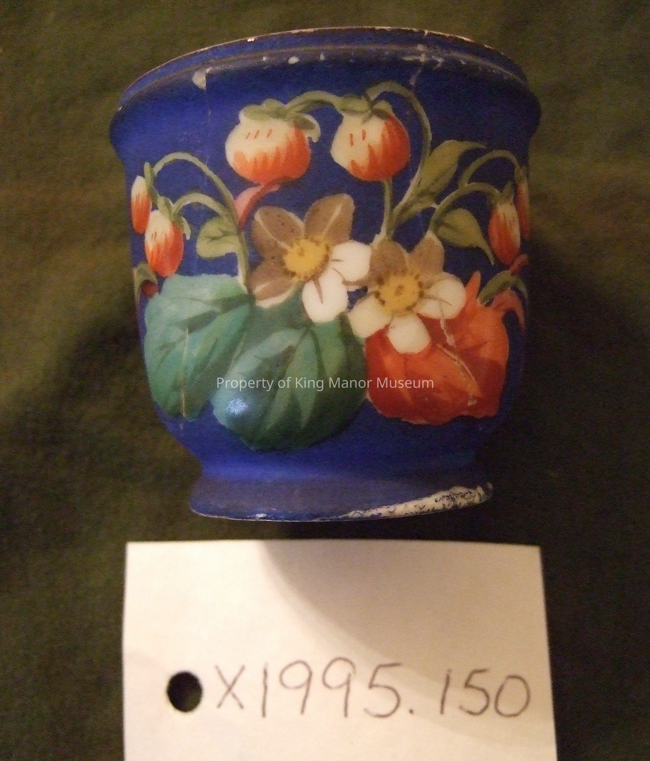 Blue painted white porcelain cup having polychrome floral sprig; paper sticker marked Anderson