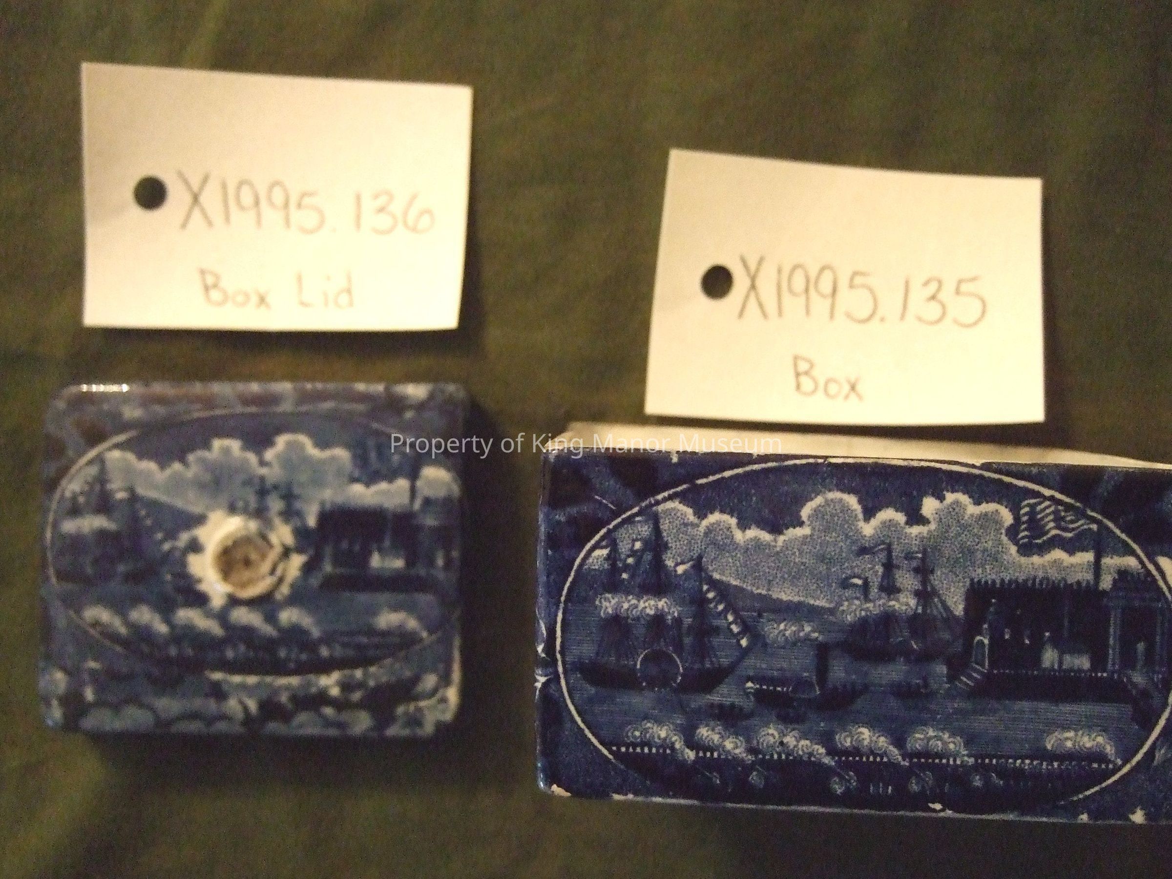 Porcelain flo- blue decorated box having a ship scene with floral; paper sticker marked Anderson