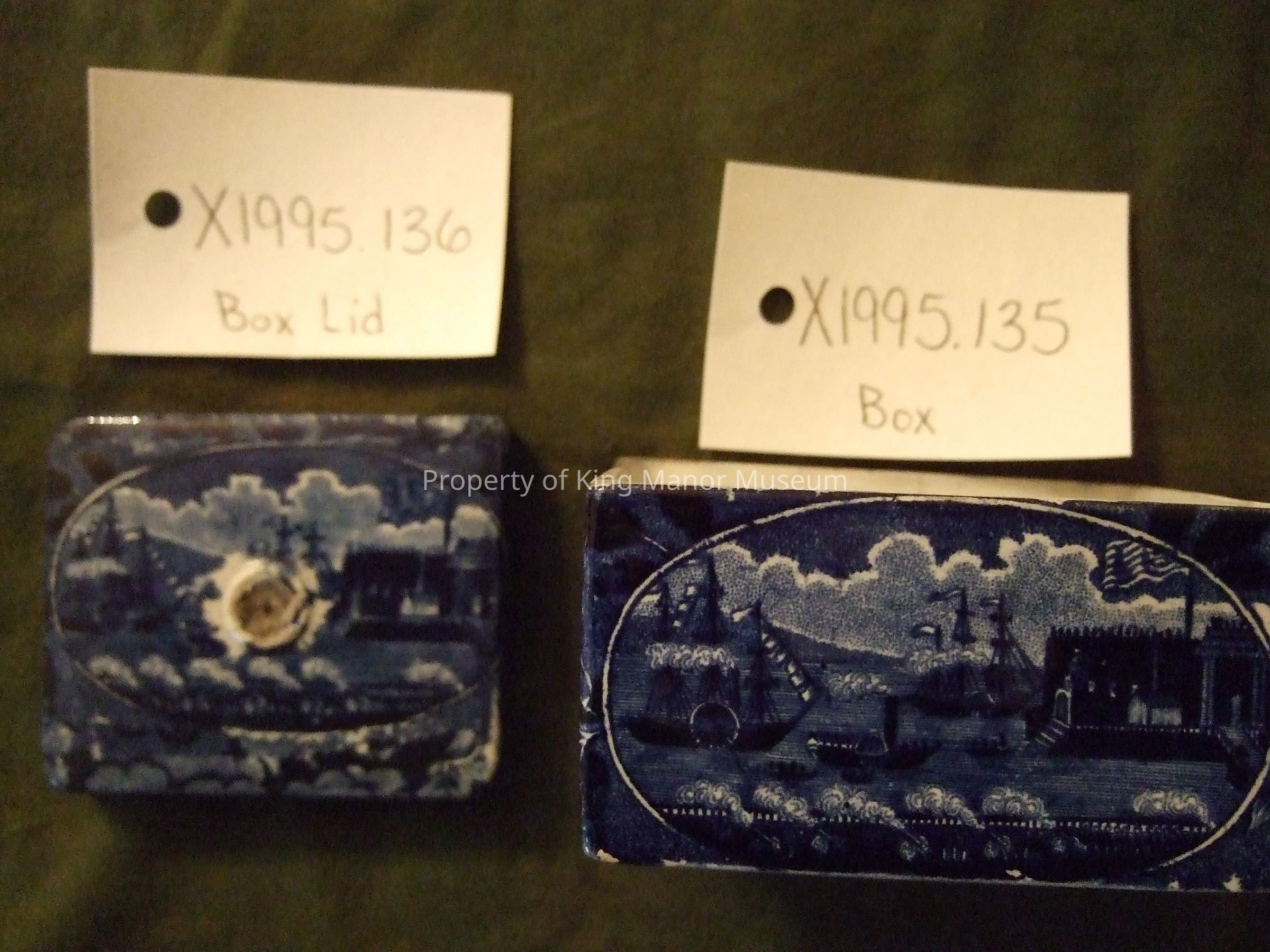 Lid for porcelain flo- blue decorated box having a ship scene with floral; paper sticker marked Anderson