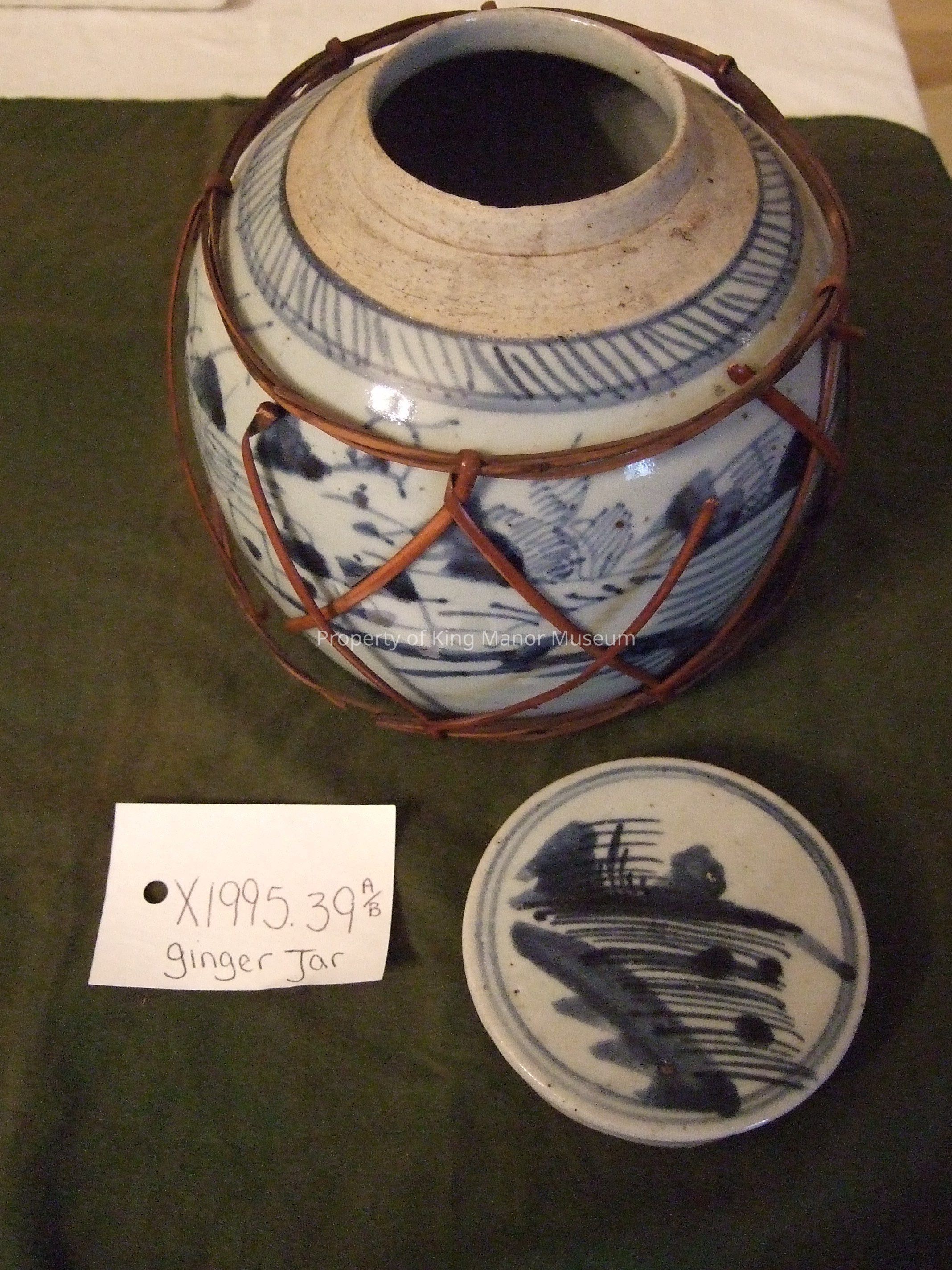 Porcelain export ginger jar having criss-crossed straw sling and porcelain cover (b)