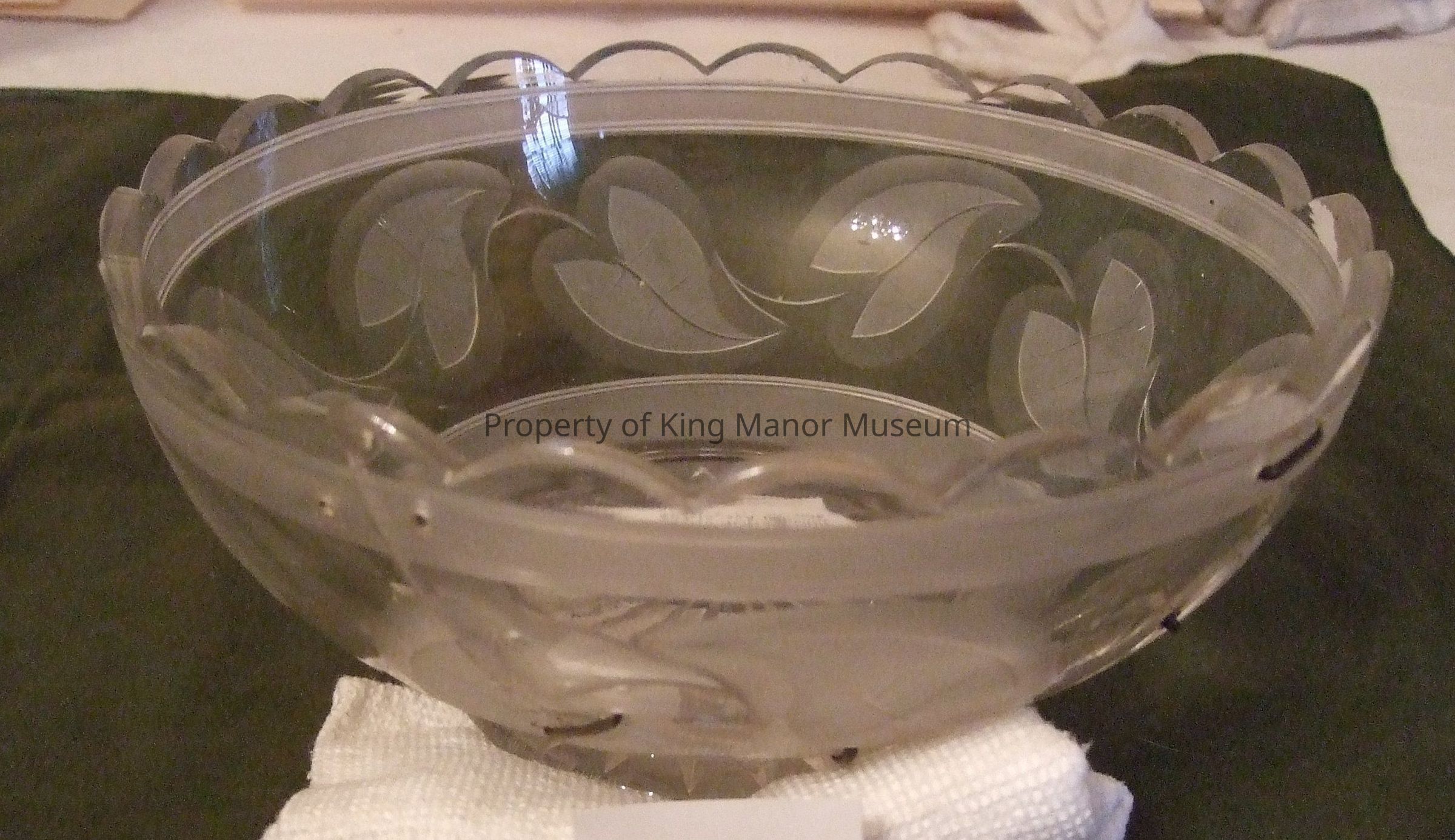 Cut glass bowl having scalloped rim and etched leaf on vine decoration; the base having sunburst motif