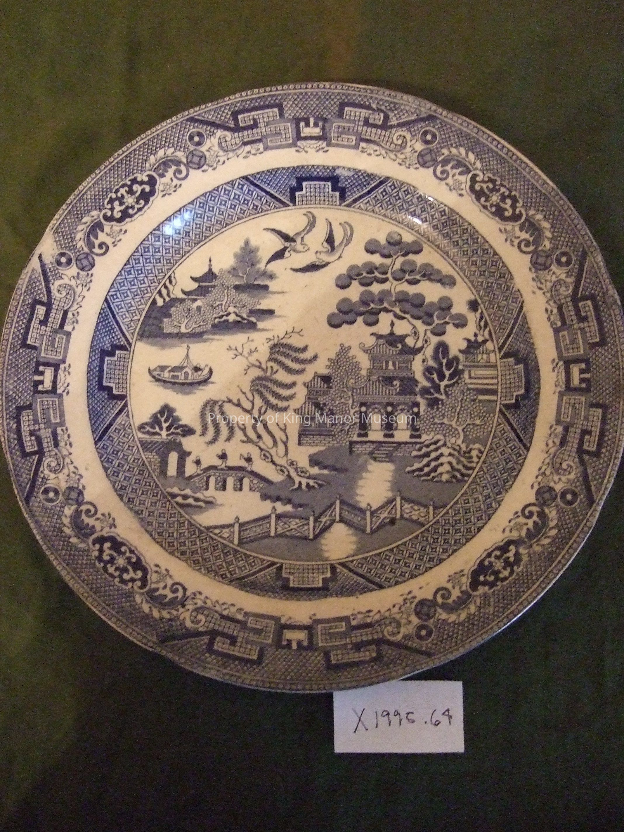 Blue willow pattern plate; the mark on reverse, JNMPBC--- with bell and crown and laurel
