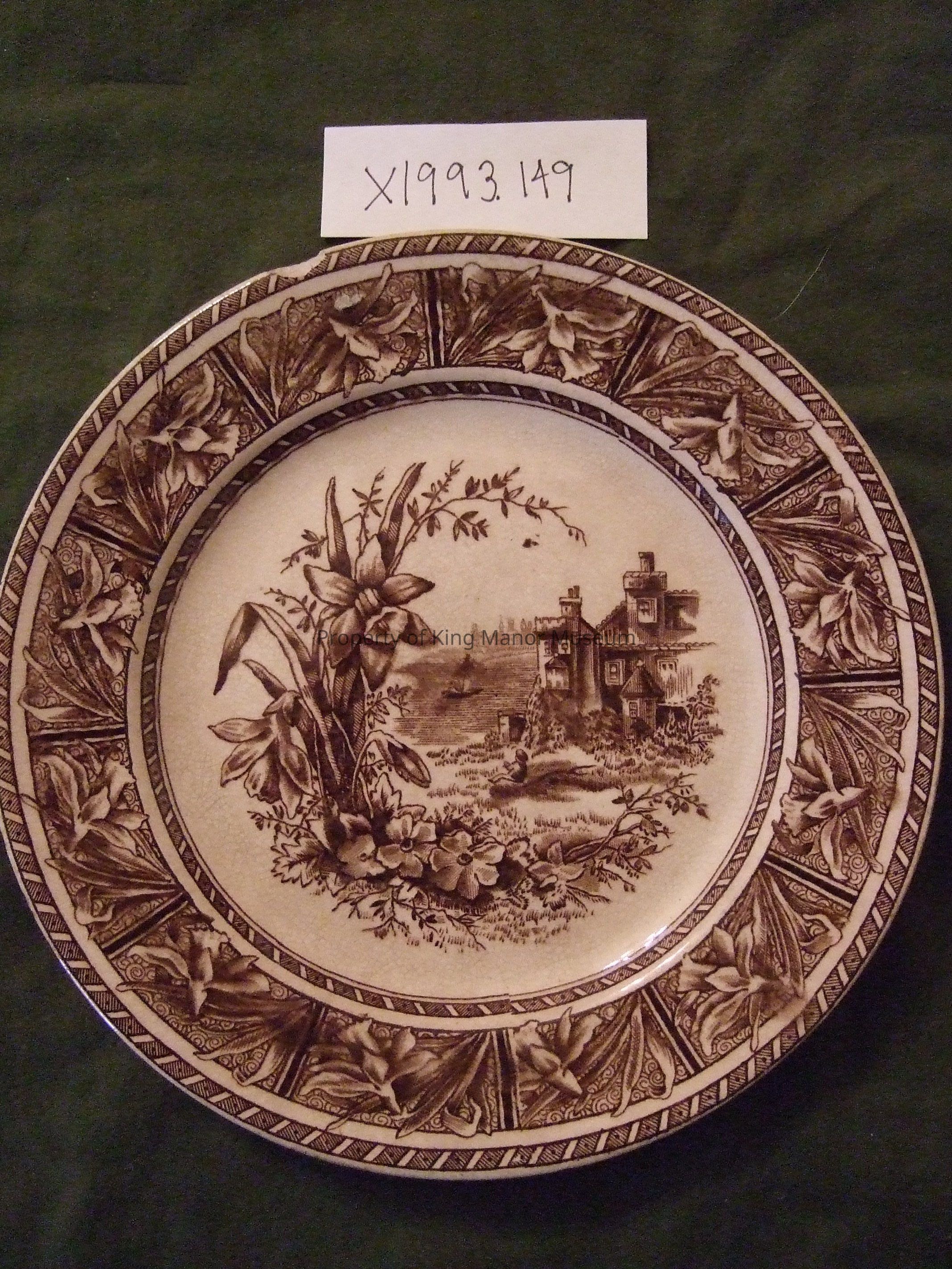 Ceramic plate having brown transferware decoration featuring a daffodil rim at the center a house, the ocean and a figure; the underglaze mark reads WH GRINDLEY AND CO TUNSTALL, the pattern name DAFFODIL; the paper sticker reads AndersonCollection