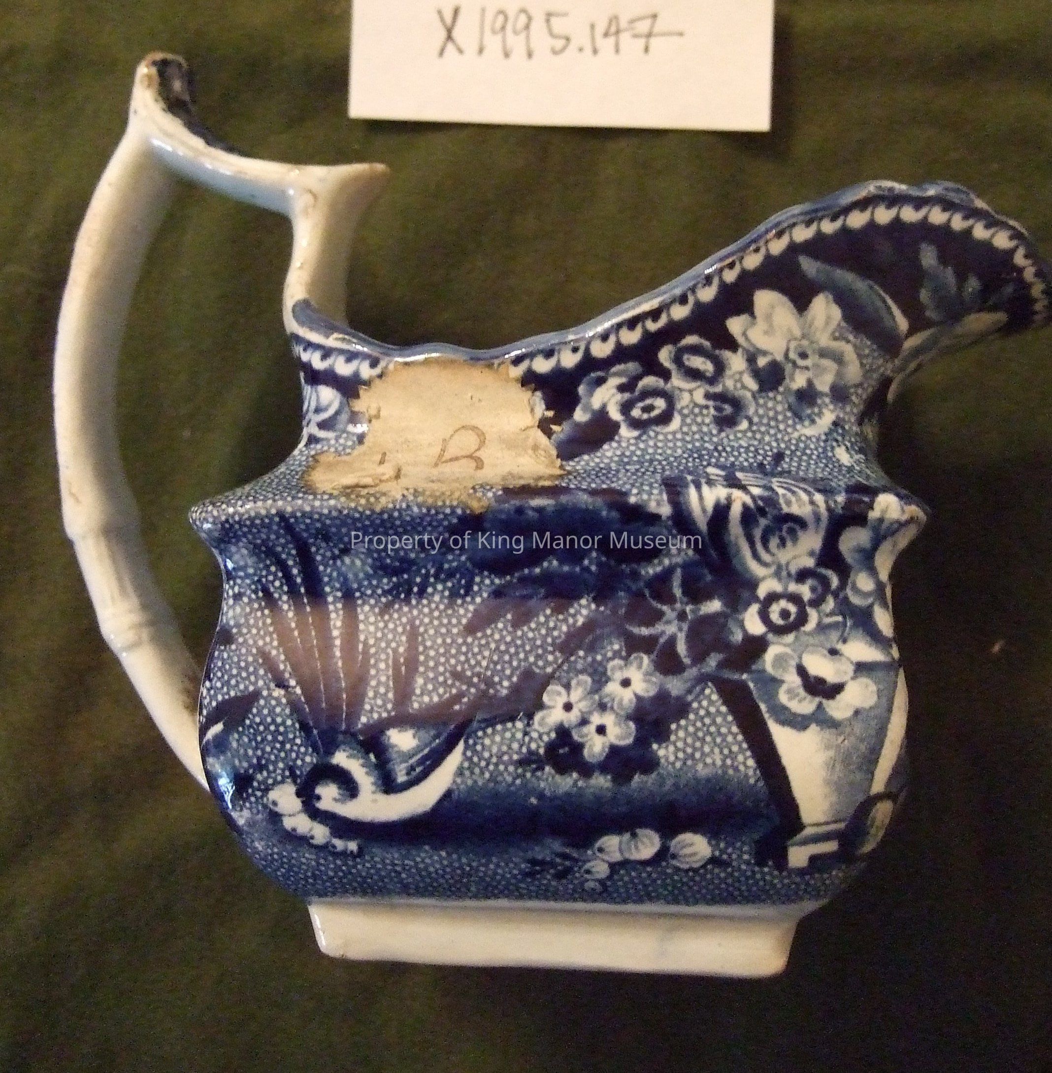 Ceramic pitcher having blue transfer decoration featuring a pot of flowers and birds; the paper sticker on base is illegibleCollection