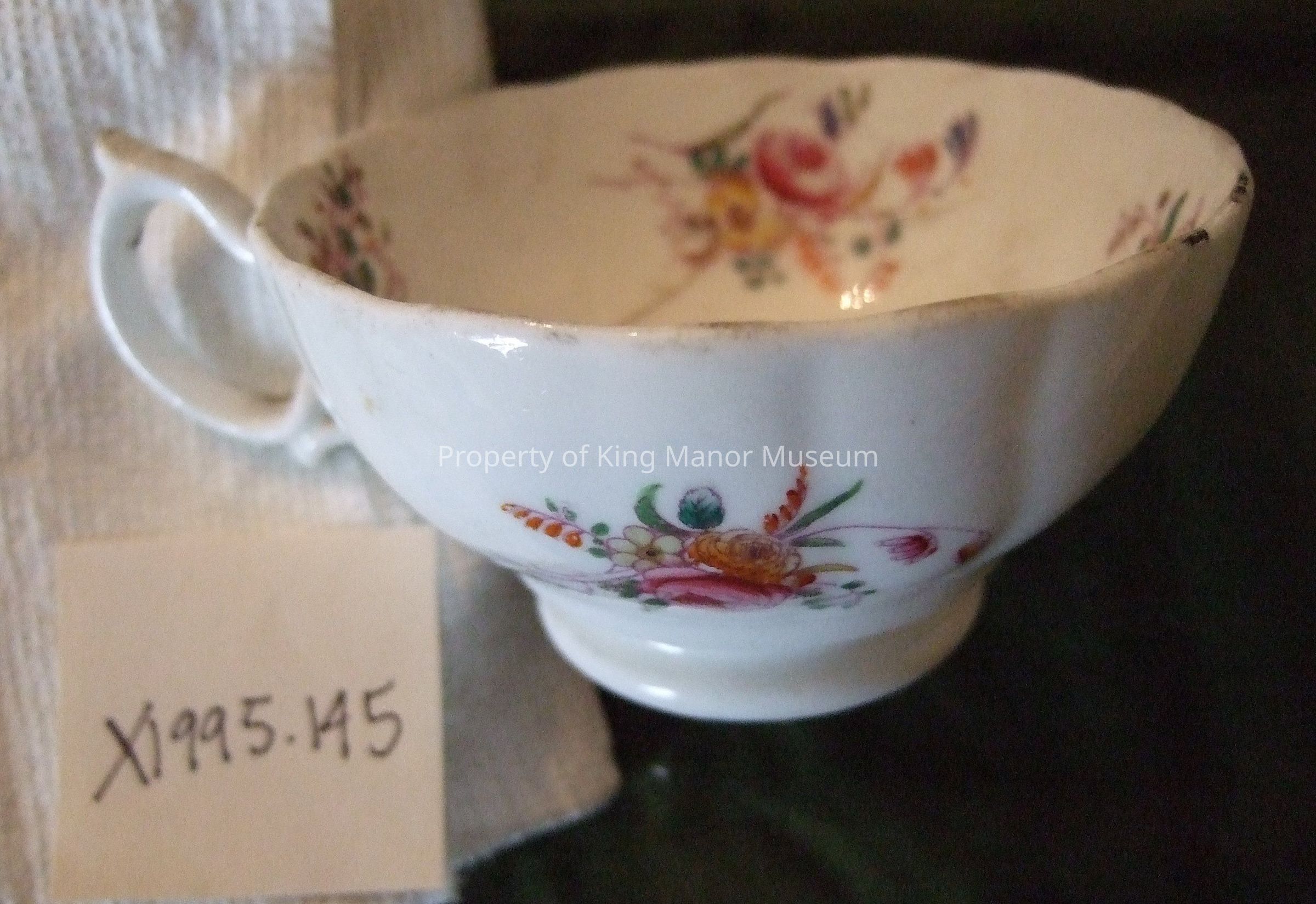 White ceramic footed teacup having floral bouquets of rose and sprig; several cracks in bowl; paper sticker with the letter L on undersideCollection