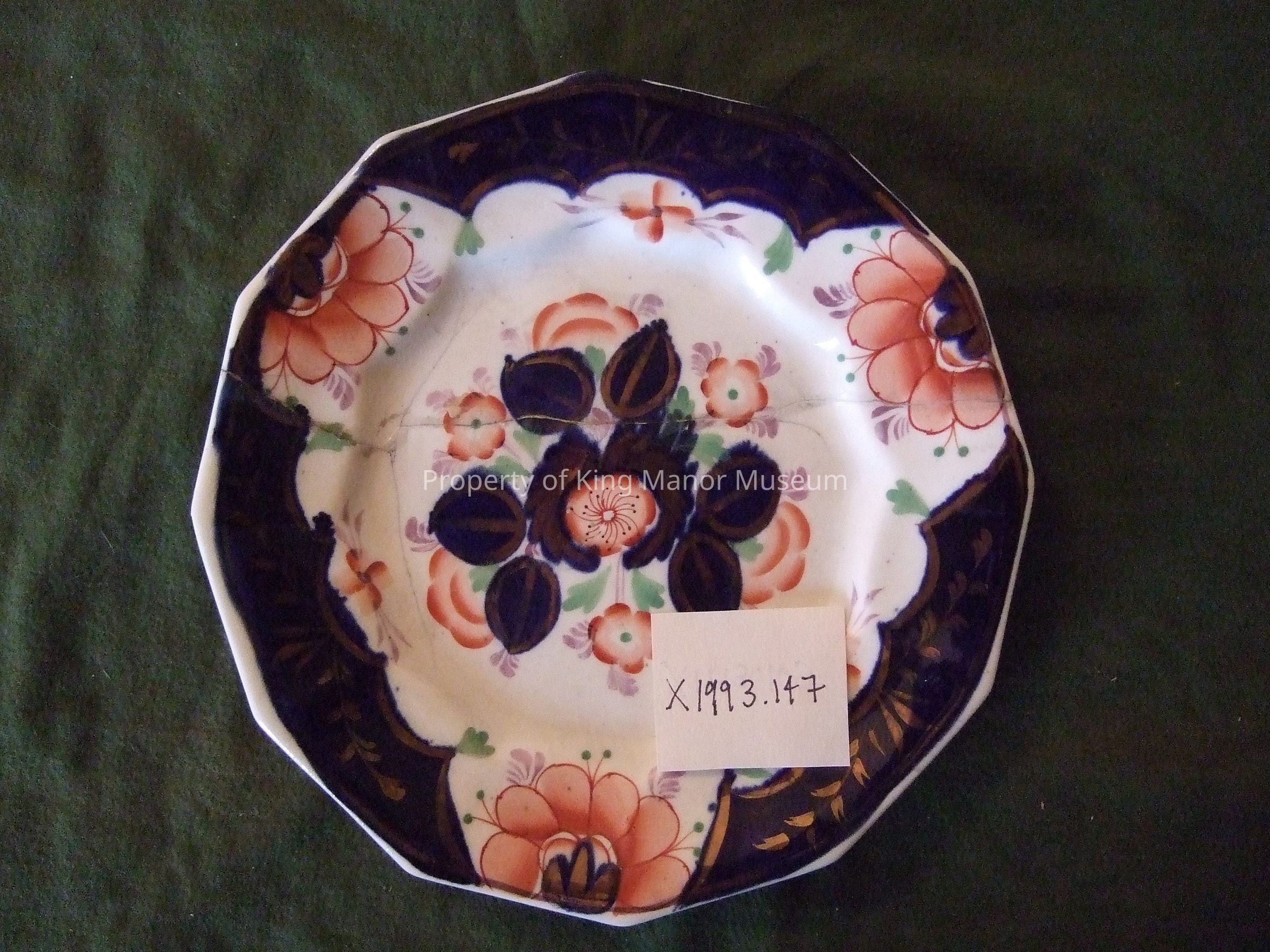 Porcelain plate having slight lustre finish the rim decorated with handpainted indigo blue reserves alternating with pink flowers