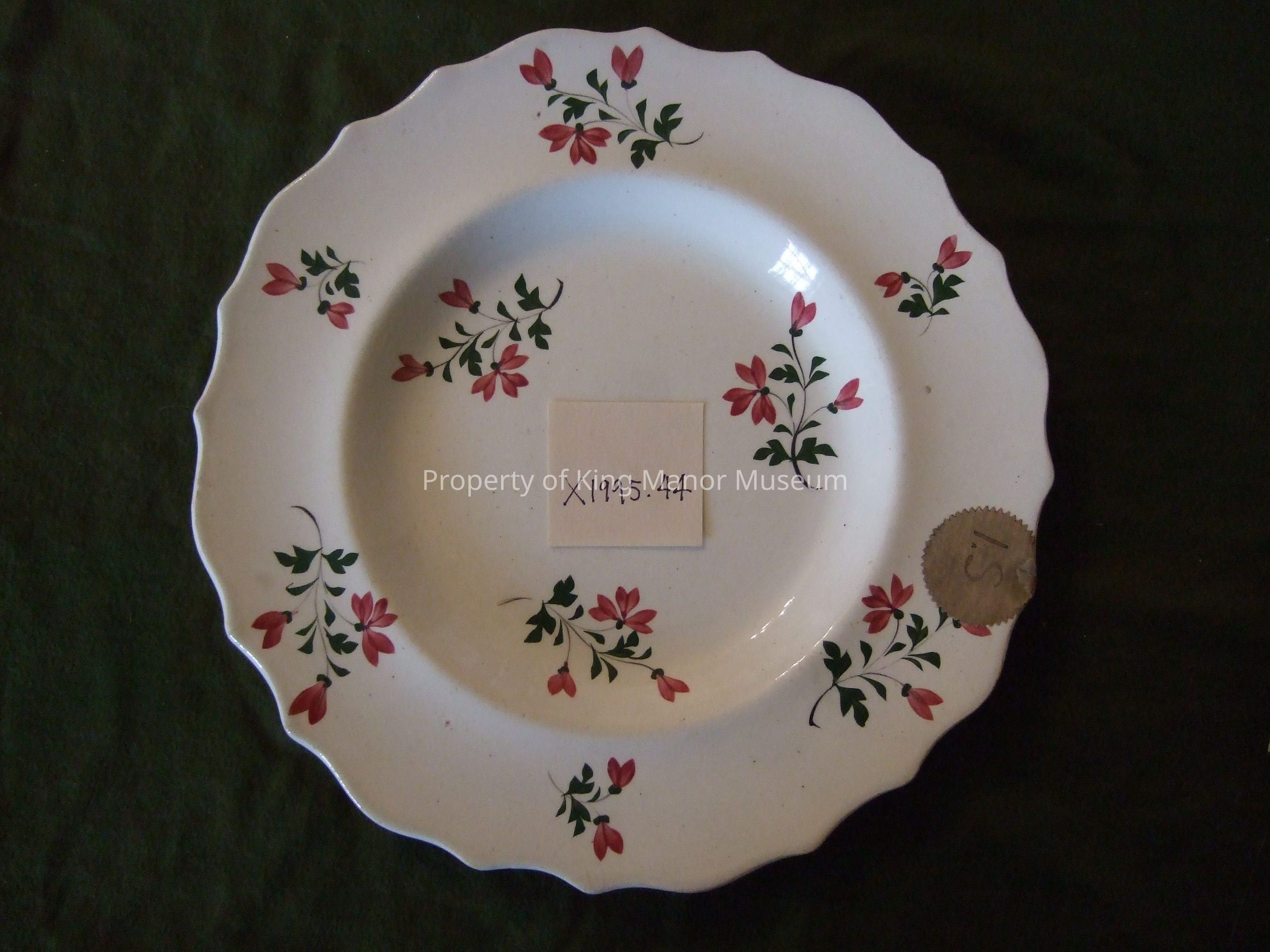 White porcelain plate having shaped-edge, high rim decorated with springs of red flowers; the paper sticker on base reads AndersonCollection