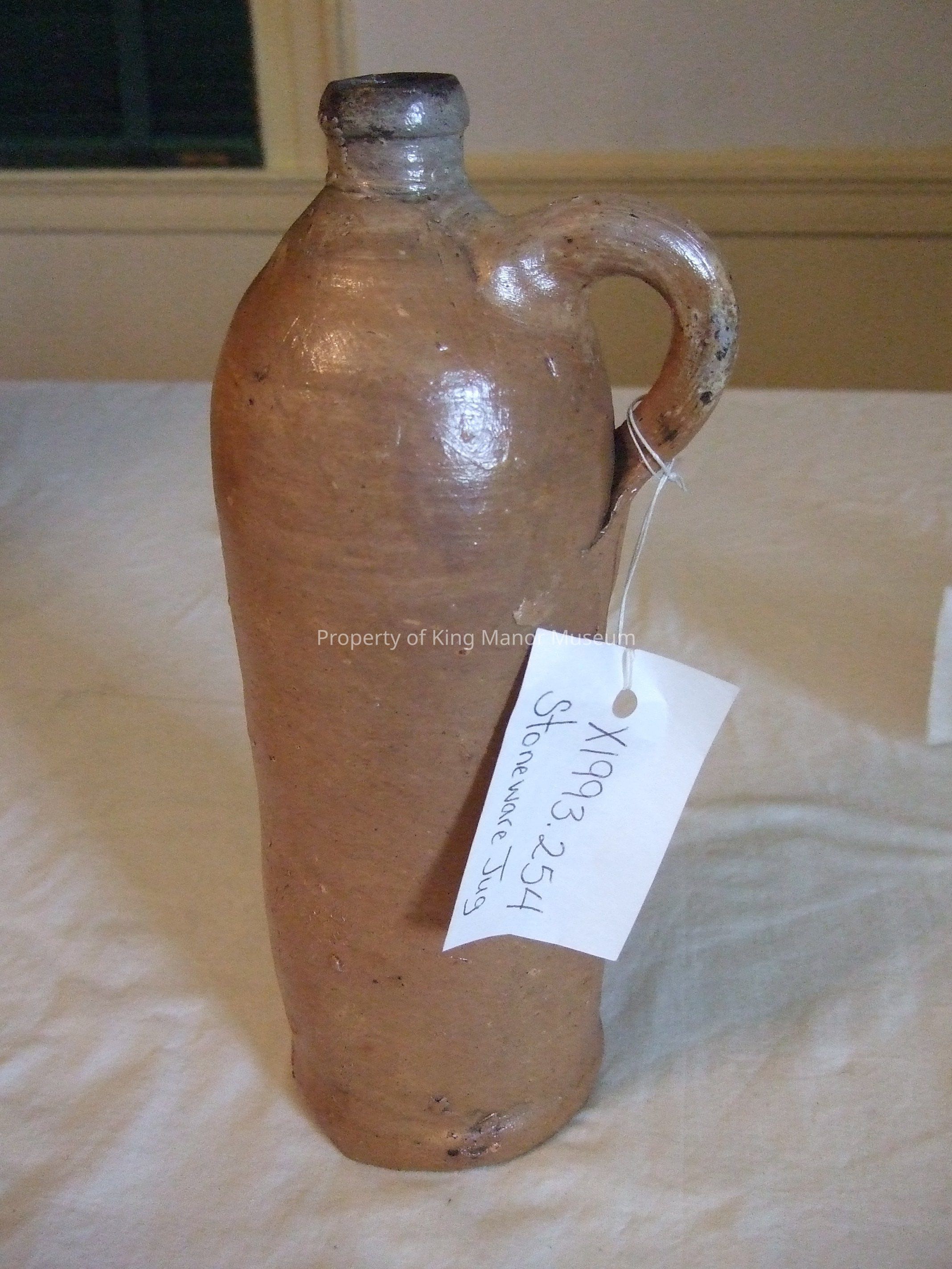 Clay jug of tall, cylindrical shape having narrow neck and applied handle; the incised mark on shoulder includes K, M, and two backwards N lettters; see photo in recordCollection