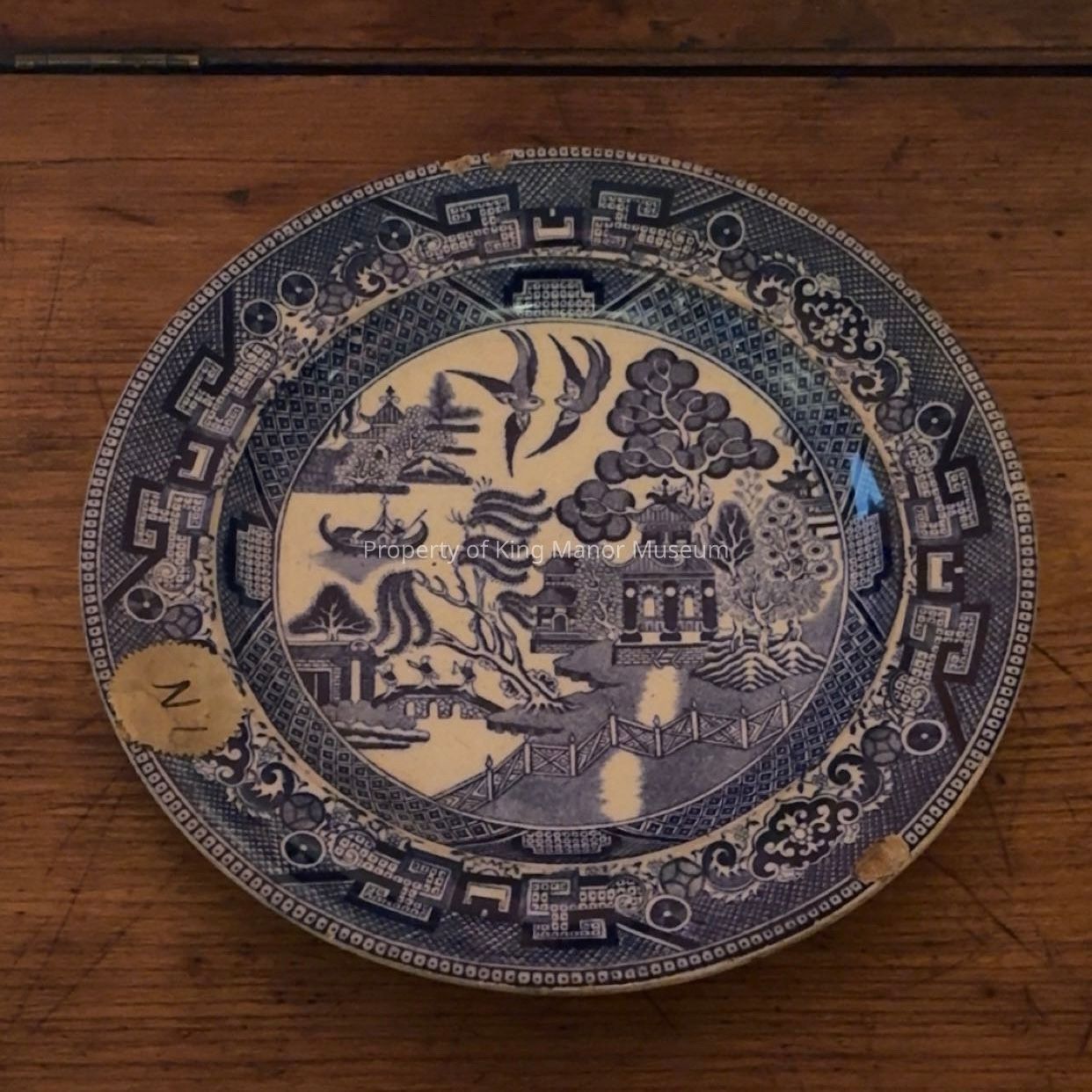 Transfer decorated Blue Willow pattern plate; paper sticker on front ca. 1900 (reads "1.N"), two paper stickers on back, red border ca. 1900 (reads "Andrews"), ca. 1960s moving sticker.Collection