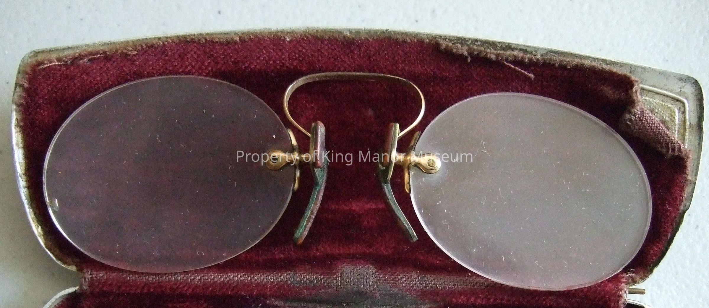 Pair pince-nez housed in repousse decorated silver case having red velvet lining