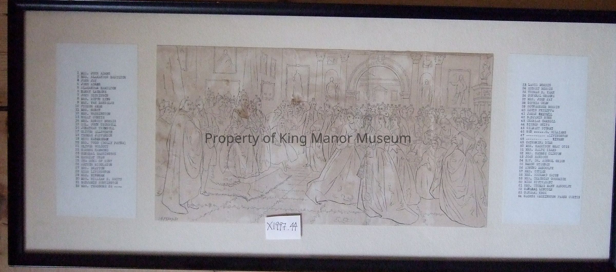 Print of line drawing of Martha Washington's reception signed by I.G. Peso A.S.S., accompanied by rosters of names which flank the print on mat surface; the print framed in molded wood frame-de-framed and rehoused August 2025Collection
