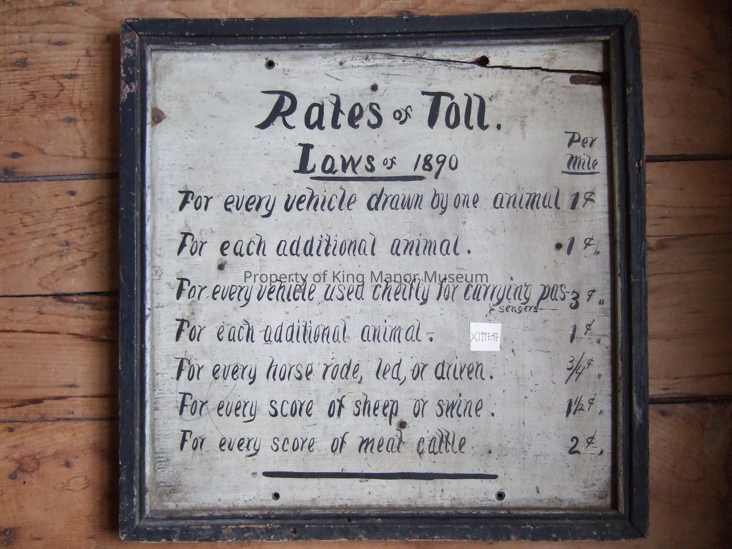 Hand printed ink on paper roster "Rates of Toll Laws of 1890"; housed in wood frame