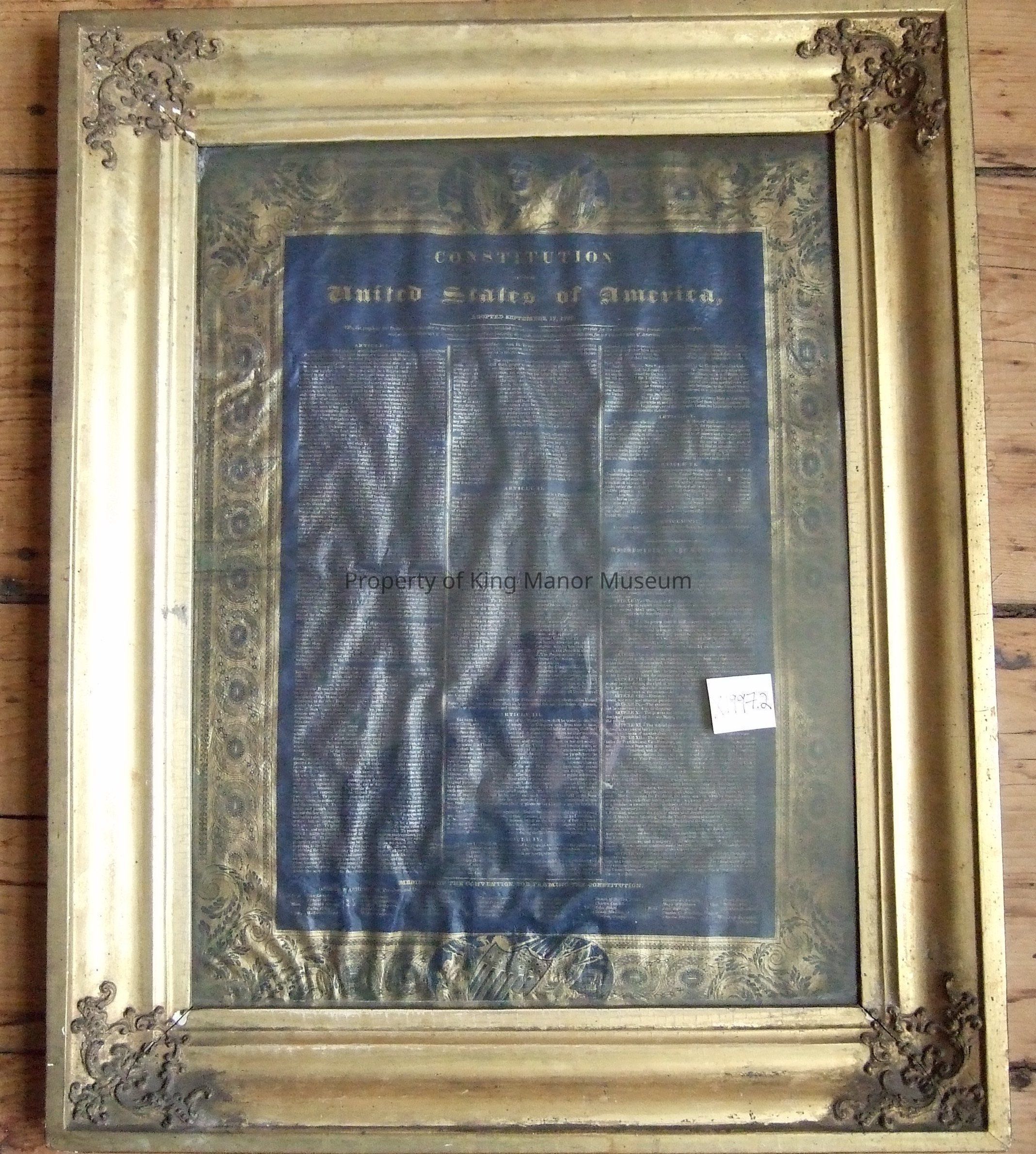 Print of the US Constitution printed in gold on blue paper framed in gold painted frame