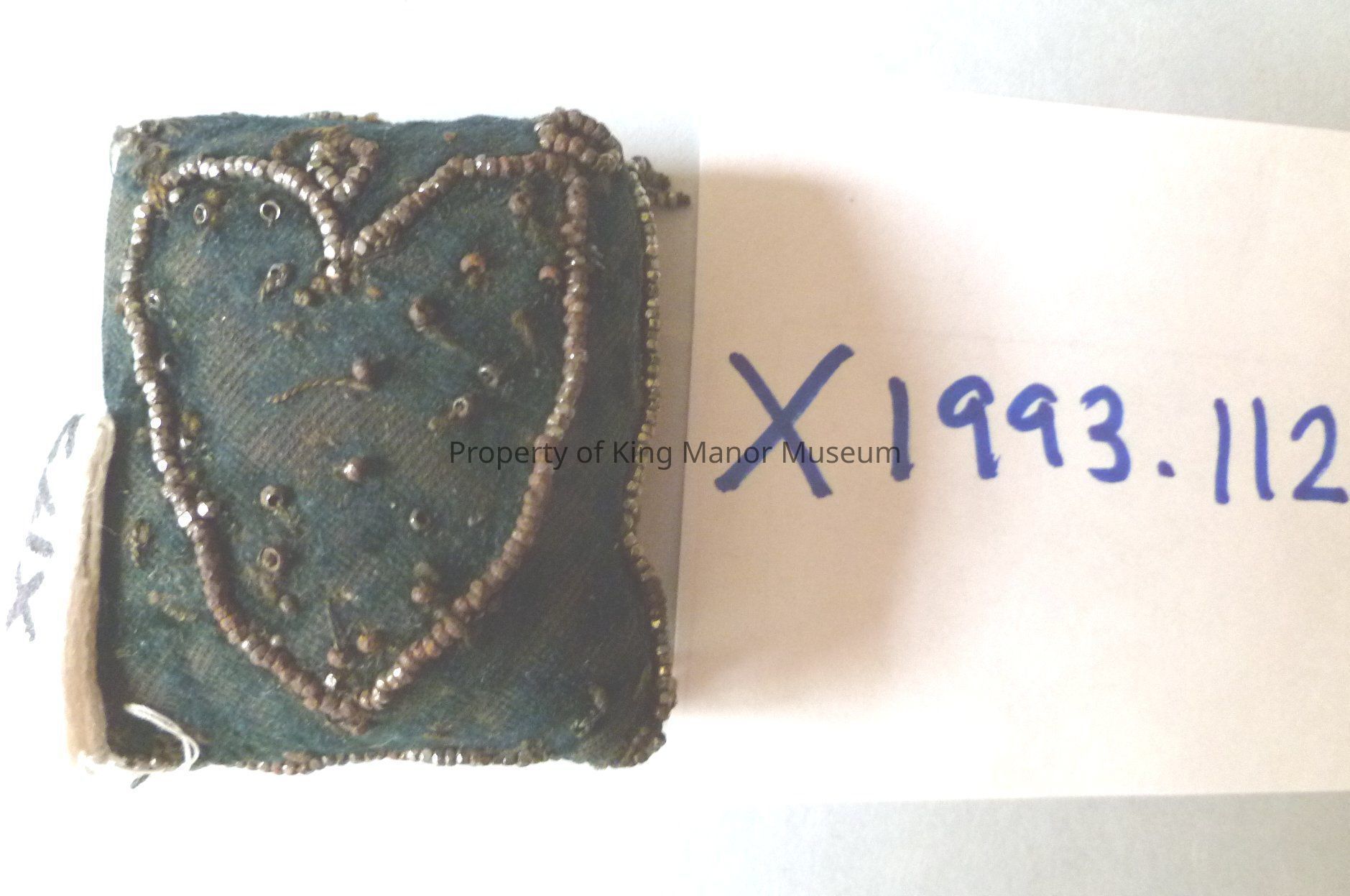 Pincushion of uneven square shape having beaded surface featuring a heart motif