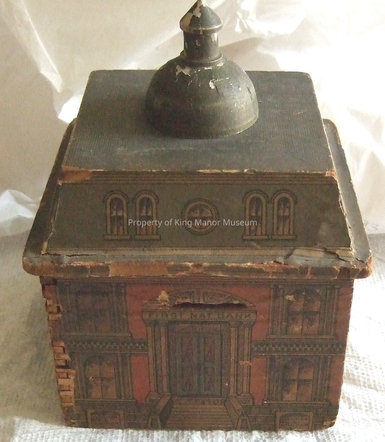piggy bank of square shape having paper cover illustrating a bank having mansard style roof and cupola