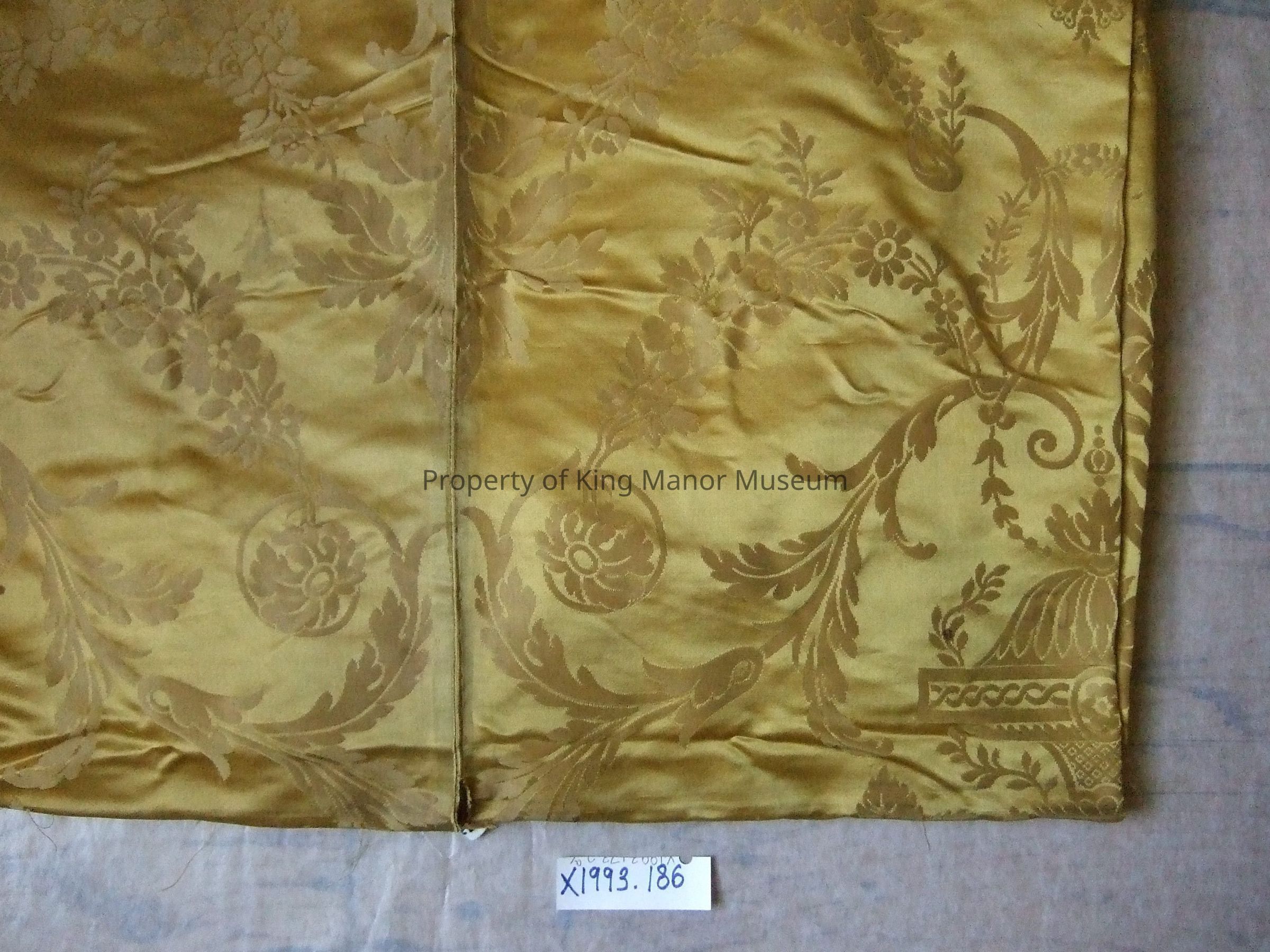 Gold silk damask curtain panel featuring a foliate scroll pattern