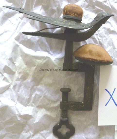 Iron clamp or "sewing bird" with stuffed cloth pads for pins and needles