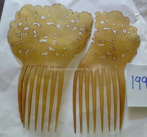 Light tortoiseshell comb having pierced floral design head; the comb is split in two, .1,.2