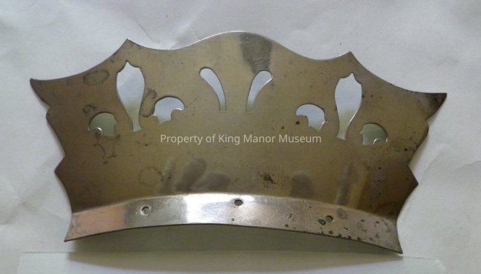 Polished white metal object resembling the head of a crown having shaped top, pierced decoration and bottom rim pierced with holes as if for nails or screws