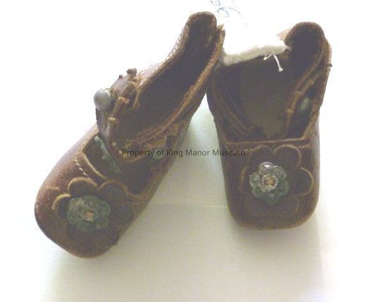 Brown leather doll shoes having leather strap closure and leather floral decoration on toe
