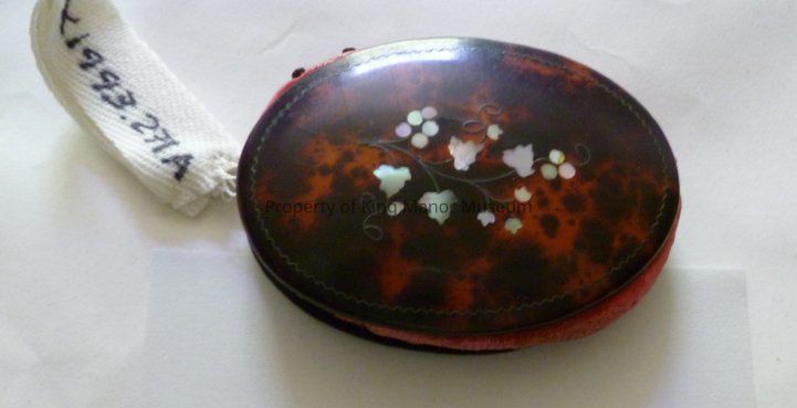 Oval pink pincushion encased in a tortoiseshell case having inlaid decoration