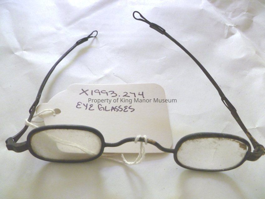 Bent wire eyeglasses having oval glass lenses and looped end arms