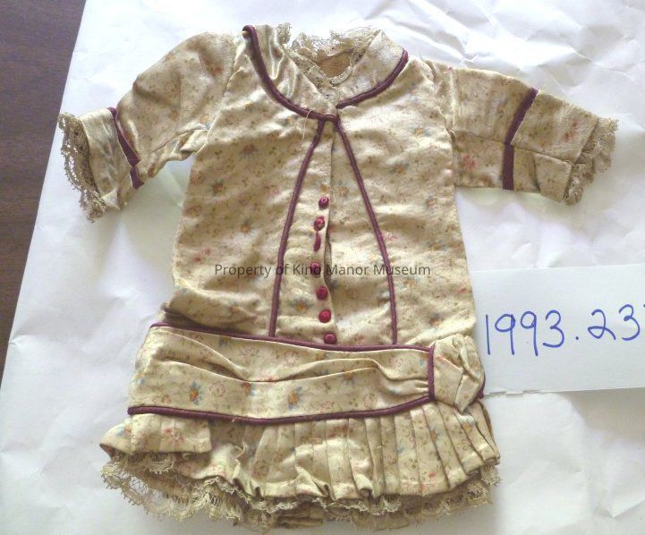 Floral printed off-white cotton doll dress having a pleated skirt and decorated with lace at neckline, sleeves and hem and maroon piping accents