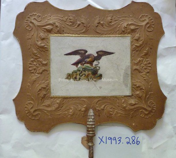 Paper fan screen having acanthus scroll embossed bordef having shaped edge framing the depiction of an eagle and snake