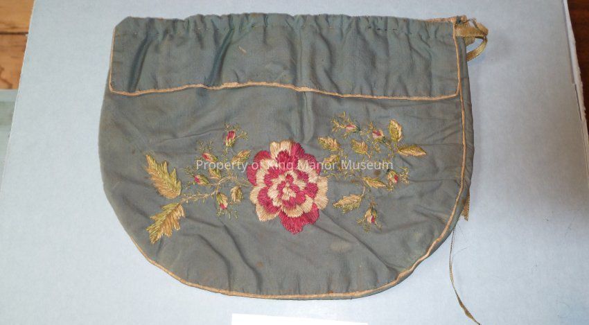 Green fabric purse having drawstring top, rounded bottom and red and pink embroidered floral decoration