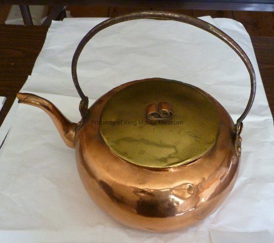 Copper water kettle having mixed metal or brass lid (b), bail handle of iron and gooseneck spout having bifurcated endCollection