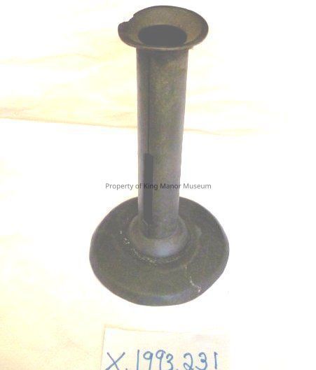 Footed candlestick of metal construction having cylindrical stem finished with flared lip; the lip bearing evidence of a once attached thumb handle, the shaft is split as to have once been fitted with a candle extender; label on bottom bears the writing, Elizabeth Whitney ShawCollection