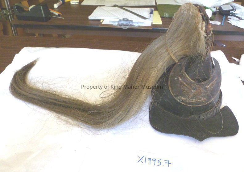 Leather and metal ceremonial or military helmet of hood shape having visor and attached horsetail decorationCollection