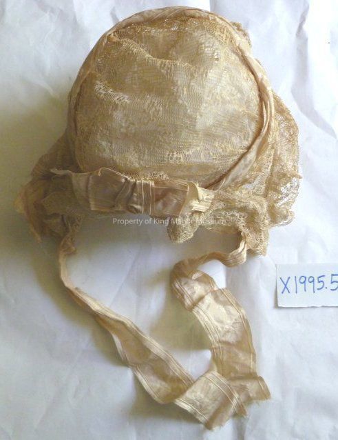 Ecru net lace bonnet having pale pink satin cloth band encircling the crown, a satin bow decoration at base of neck and lace ribbon tiesCollection