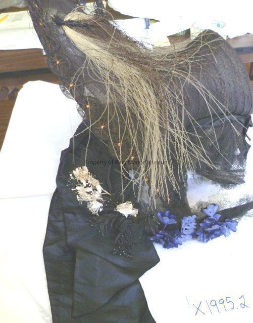 mid-19th century Black straw bonnet having cylindrical crown, flared tapered brim, the bonnet of black net decorated with plume, flowers and beading, fitted with a grosgrain bow and tulle ruffle at back of crown and ribbon ties at necklineCollection