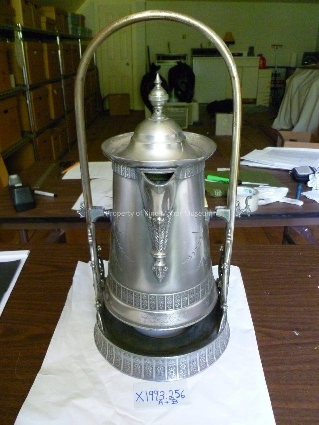 Silver presentation tankard of tapered cylindrical shape having hinged lid and applied spout, the tankard suspended to swing forward and back in a silver arched stand having round base with scroll supports; the stand and tankard having incised decorations '79"Collection