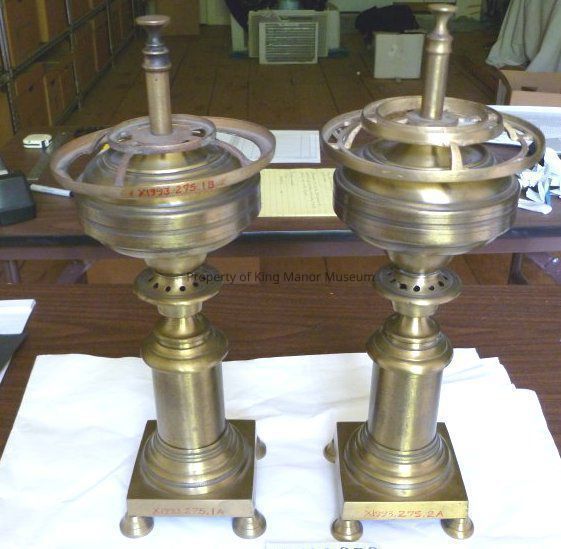 Brass argand lamp, one of two of same, having flattened round vessel fitted with ring (b) supported on round column on square base supported by conical feetCollection