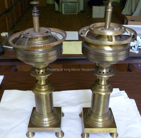 Brass argand lamp, one of two of same, having flattened round vessel fitted with ring (b) supported on round column on square base supported by conical feetCollection