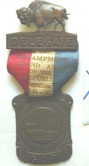 Commemorative metal of cartouche shape bearing the inscription, "Seal of the City of Buffalo NY, G A R" suspended from red white and blue striped ribbon stamped with the inscription, " 57th Annual Encampment Grand Army of the Republic," surmounted by a buffalo with head bowed standing on a platform stamped with DELEGATECollection