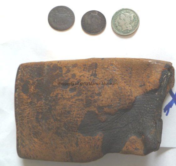 Leather purse having two compartments accompanied by three coins: Canadian 5 cent; US coin 1881; illegible "Hispan" lettering on thirdCollection