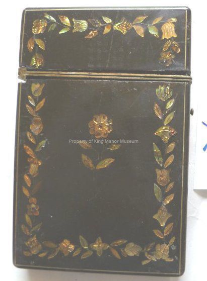 Card case having hinged lid decorated with mother-of-pearl floral garland