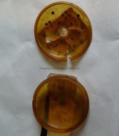 Horn snuffbox of circular shape having lid of same, the box decorated with metal studs