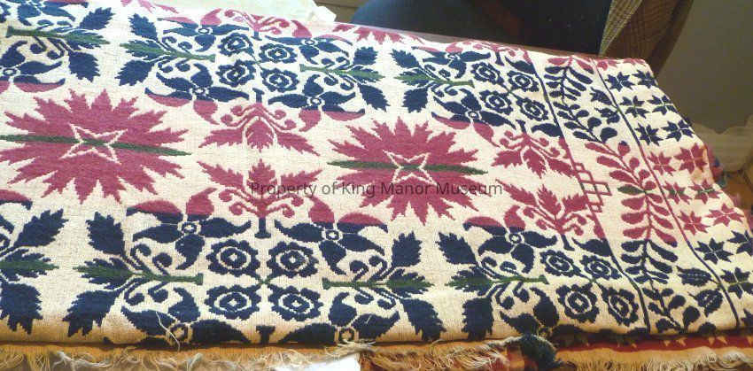Coverlet of the Biederwand style having red and blue design on off-white base featuring meandering vine and floral