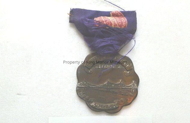 Commemorative metal of round shape having scalloped edge fixed to blue ribbon commemorating the Queensboro Bridge 1909Collection