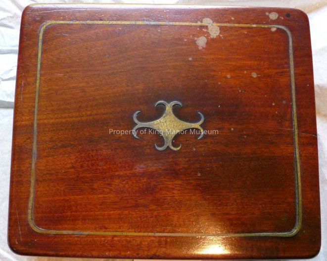 Varnished wood shaving box having brass inlaid hinged cover opening to reveal interior compartments holding a brush (2), razor (3), razor case (4) and tweezers (5)