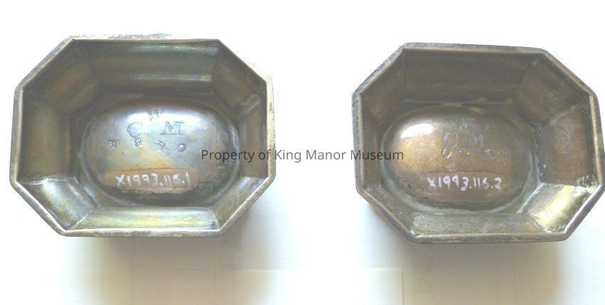Sterling silver salt cellar, one of two of same, of faceted, tapered plinth shape, the undersides bearing makers marks and the initials W C MCollection