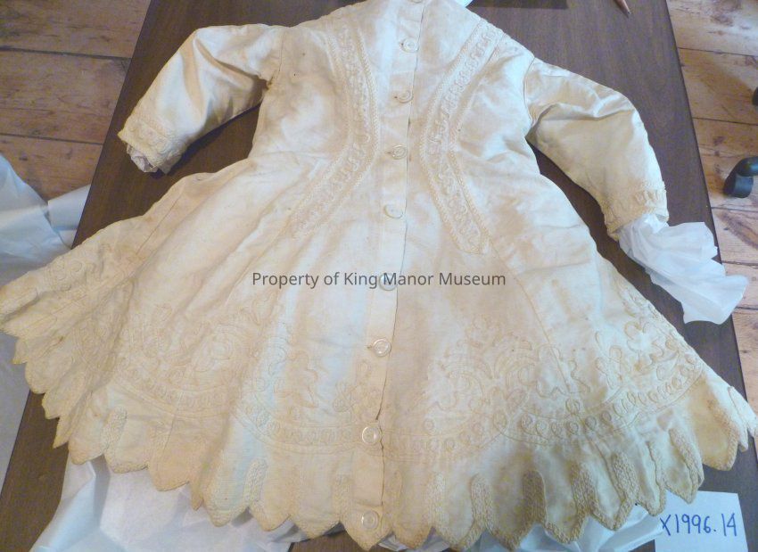 Off-white cotton child's dress having long sleeves, button fronted having gored skirt finished with flared pointed scalloped hem; the dress decorated with passementerie on front and hem