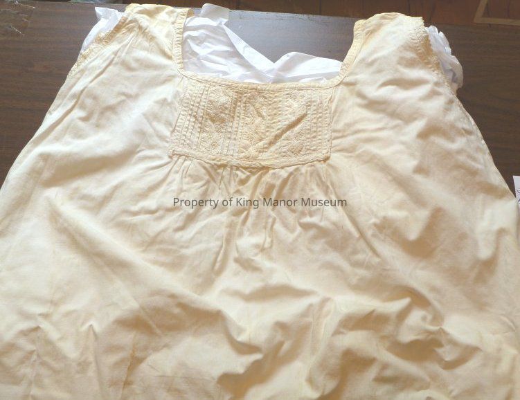 Off-white cotton chemise having square neck embellished with decorative tucks, embroidery and openwork flowers